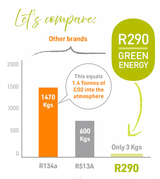 All of our refrigerated products use R290 non-toxic propane gas - a naturally occurring organic compound of hydrogen and carbon, with minimal impact on the environment